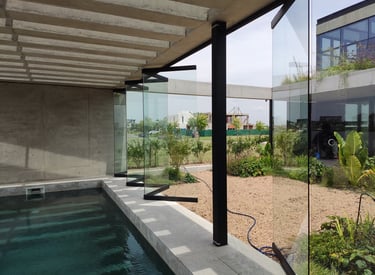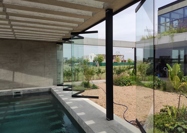 En una elegante vivienda unifamiliar ubicada en el country Puertos del Lago, en Nordelta, hemos implementado un innovador cerramiento plegable que destaca por su funcionalidad y diseño contemporáneo. Con solo un movimiento, todas las hojas del sistema se apilan de manera ordenada contra una pared, permitiendo una apertura completa que maximiza la conexión con el entorno. Este sistema no solo es práctico, sino que también se integra estéticamente en el espacio, gracias a sus líneas limpias y minimalistas. Además, está fabricado con vidrios templados de seguridad y perfiles anodizados horizontales, eliminando cualquier obstáculo vertical que pudiera distraer de las vistas panorámicas. Así, los habitantes pueden disfrutar de una visibilidad absoluta del paisaje circundante, creando un ambiente perfecto para relajarse y conectar con la naturaleza.